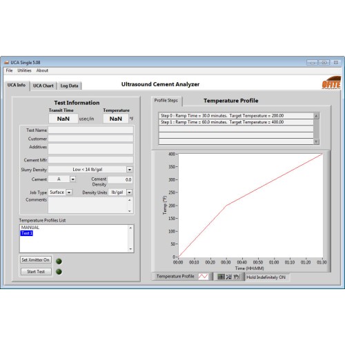 By measuring the change in velocity of an acoustic signal, the Ultrasonic Cement Analyzer provides a continuous non-destructive method of determining compressive strength as a function of time while at temperature and pressure.