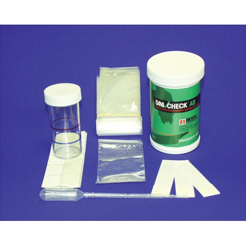 The Sani Check AB Kit #110 allows you to determine aerobic bacteria in aqueous and non-aqueous liquids. A saturated test paper strip is incubated for a period of 24-72 hours and then compared to a color chart to determine the bacterial count per square inch. Each kit is good for 25 tests.