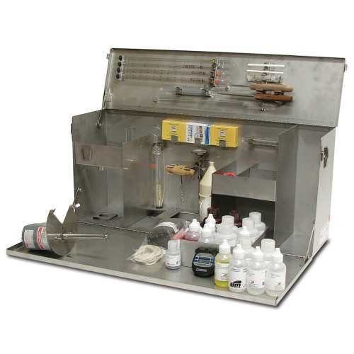 The OFITE Airplane Kit is the most complete portable mud testing kit available anywhere in a single stainless steel carrying case. It contains all of the contents of the Offshore Kit plus a stopwatch, a metal thermometer, a portable mixer and reagents for testing calcium, sulfate, hardness, and alkalinity content.