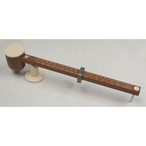 The plastic mud balance is engineered so that the mud cup at one end of the beam is balanced by a fixed counterweight at the other end, with a sliding-weight rider that moves along a graduated scale. A level bubble is mounted on the beam to ensure accurate balancing.